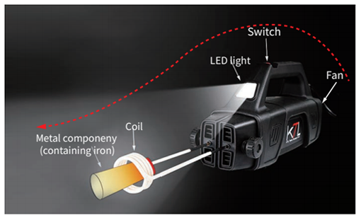 When a metal part is placed within the induction coil and enters the magnetic field, circulating eddy currents are induced within the part.