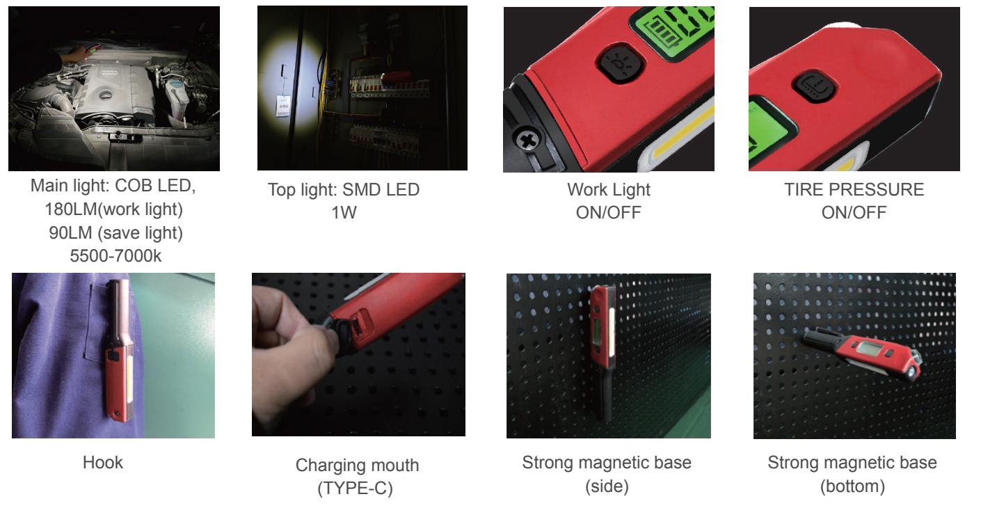 RECHARGEABLE MULTI-FUNCTION LED PEN LIGHT WITH DIGITAL TIRE PRESSURE GAUGE